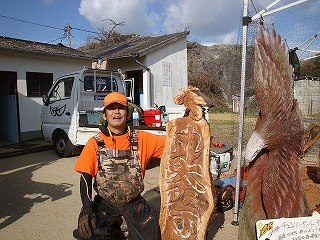 そしてもうひとつの丸太祭りがプラザ阪下の食堂前で始まりました。 今回特別に参加協力をお願いしましたチエンソーアートの久保さんであります。歴代優勝は数知れず。その腕前たるや日本でも屈指の方なのであります。そのルーツはあのねのねの清水国明さんだとか。なんだかどっかで見た事のあるチャンバー仕様のチエンソーでありました。