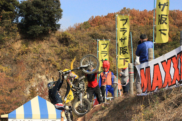 そしてこんな動画も。。。 みなさん楽しんでいただいてなりよりです(≧∀≦) 山田太陽の独走を阻止するべくただ一人だけ曲がり階段に挑み続ける選手がいました。 #4五嶋隆選手。さすがハードエンデューロ系ライダー、きれいにクリアしていきます。さらにトップの山田を上回るタイムを叩き出す周もあった。 しかし、この回り階段、ショートカットができる半面非常に体力を要すために、逆にスタミナを減らしてしまい。後半は逆に遅くなるという事態に。真田、野口、五嶋とライバルをはねのけた山田太陽は最終的に全車2LAP遅れにしてチェッカー、2017年の丸太祭を締めくくりました。 来年の丸太祭はどうするんだろう。。。。。ここ数年、奇をてらった感が強かったので原点に戻りたい、おやじちゃんはそう思ってます。 丸太は板にするとオカネがかかるのです。。。。 あ、階段はそのまま阪下に残ってますが、もう登っちゃダメですからね。使命を終えて観客用の階段になってますので。 以上、おやじちゃんレースレポートでした。 |